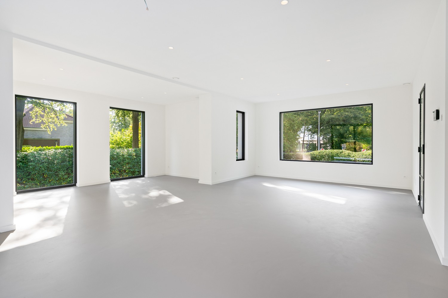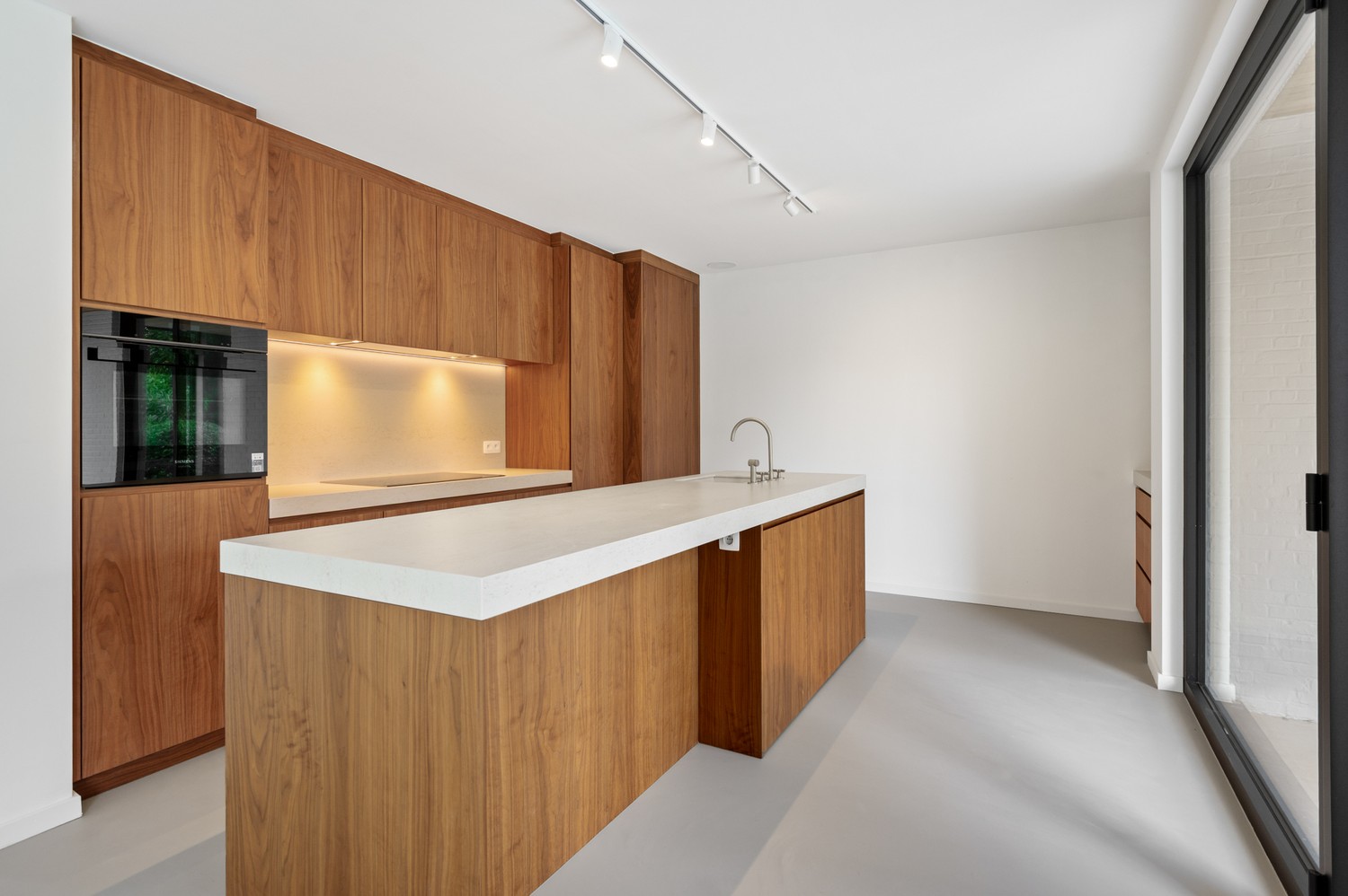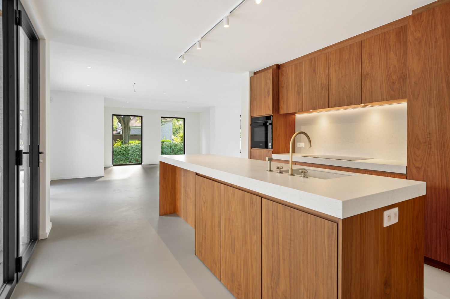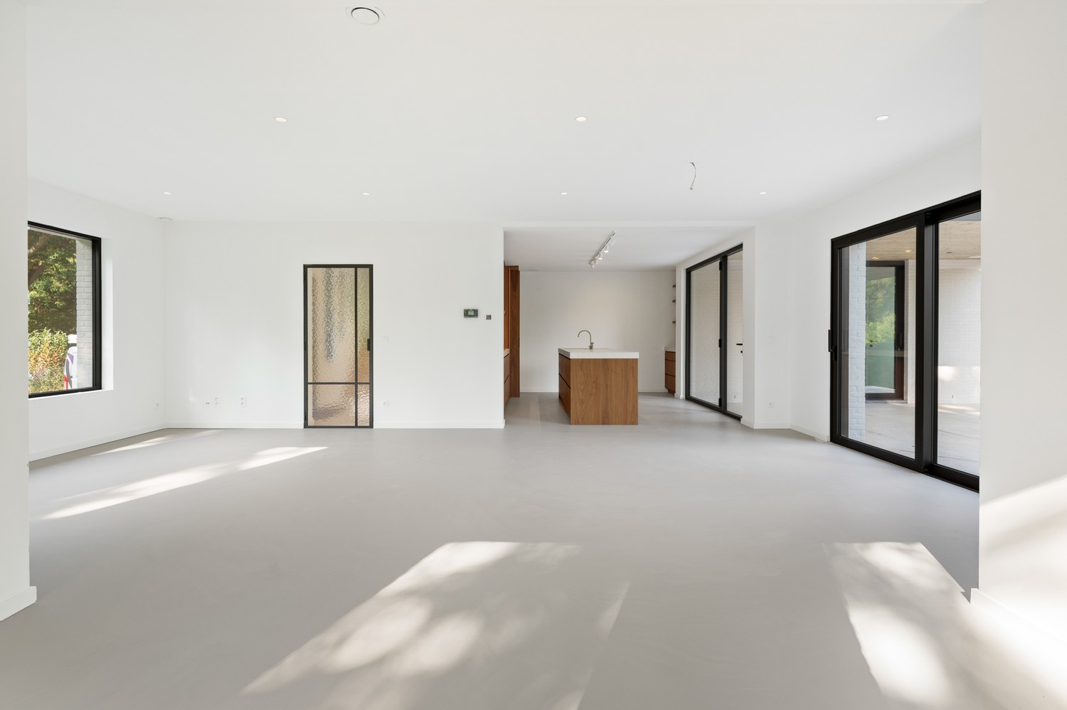 Aan de andere zijde treffen we de lichtrijke leefruimte, toegankelijk via een stalen deur met kerkglas. De microcementvloer en de grote raampartijen zorgen voor een eigentijdse en open sfeer met rechtstreeks zicht op de tuin, het terras en het zwembad. Aansluitend bevindt zich de maatwerkkeuken, uitgerust met hoogwaardige toestellen en een gezellige koffiecorner.